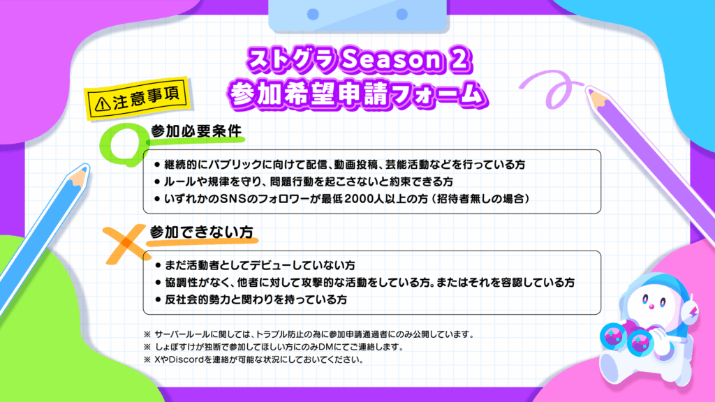 ・しょぼすけが独断で参加してほしい方にのみDMにてご連絡をさせていただきますので、XやDiscordのDM解放等のご対応をお願いいたします